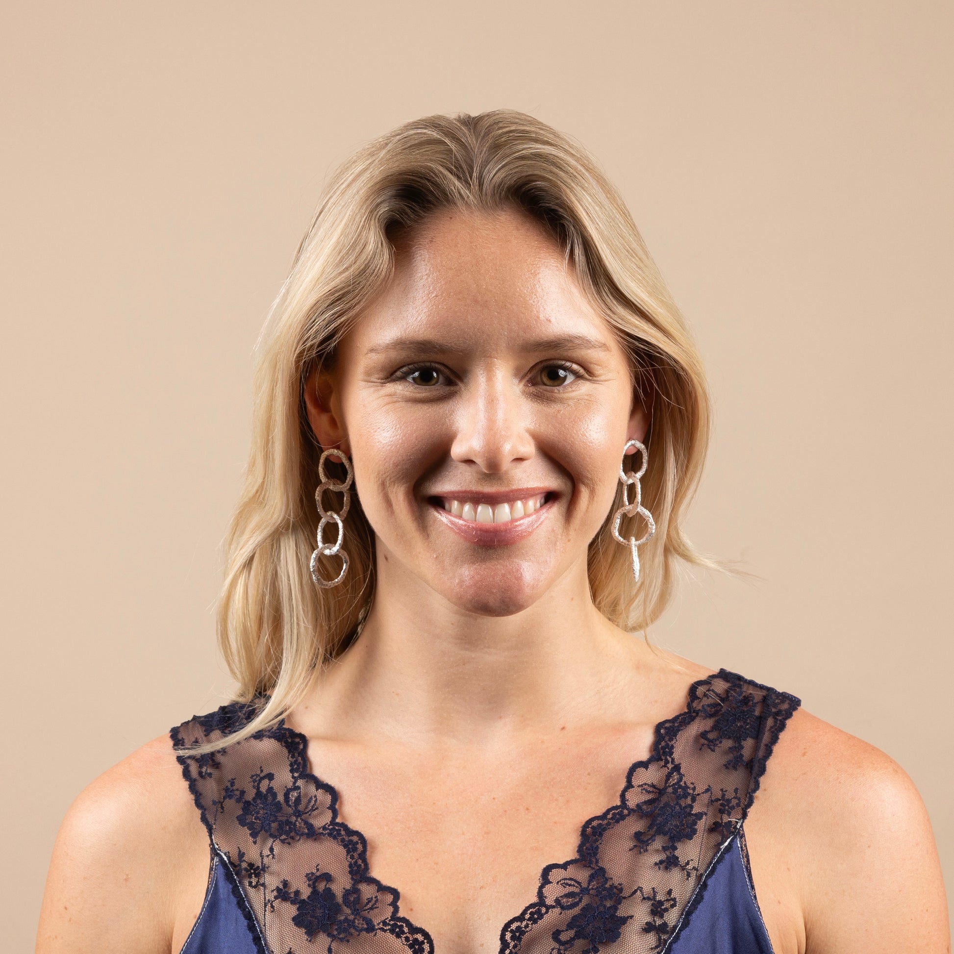 Each piece is a testament to minimalist beauty, featuring three interlocking rings with a textured surface that captures the light, creating a subtle sparkle. The gold hue radiates warmth and luxury, suggesting a composition of gold or a gold-toned material. The interlocked rings symbolize unity and strength, making these earrings not only a stylish accessory but also a meaningful gift.