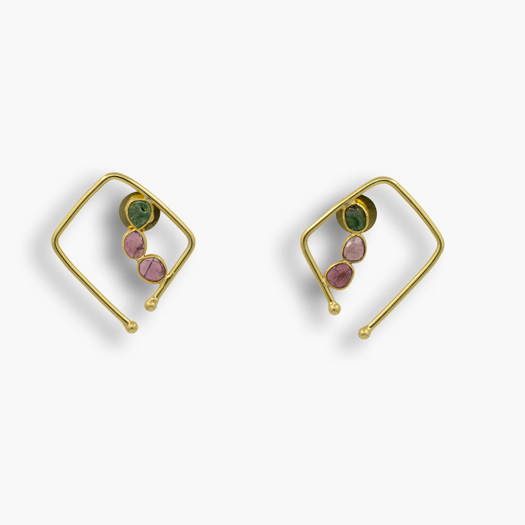 Each earring is a work of art, meticulously crafted into an elongated diamond silhouette. Within this frame of geometric perfection, a quartet of gemstones in a cascade of colours - emerald green, blush pink, and diamond white - beckons the eye with their intricate cuts and radiant sparkle.