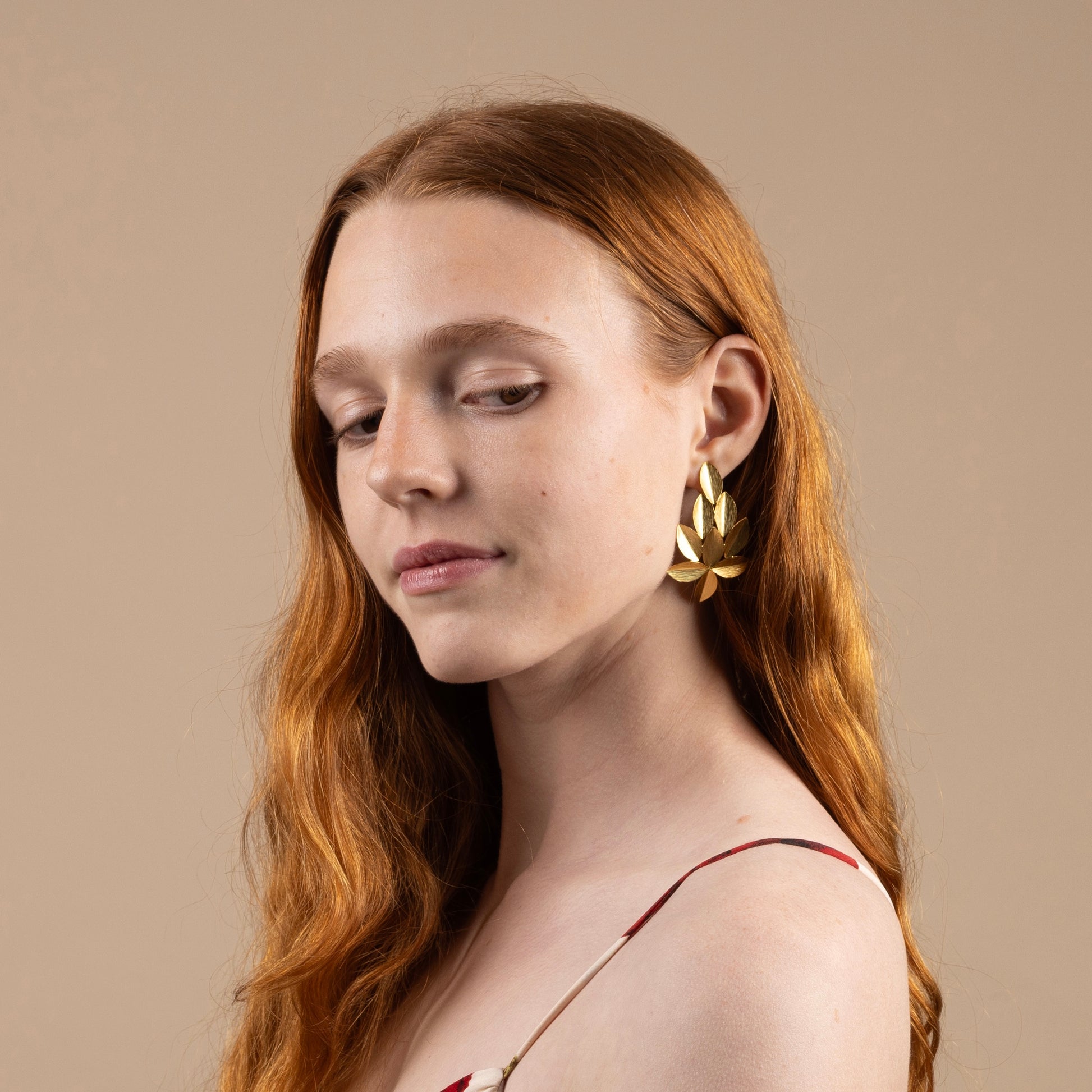 Embrace nature’s elegance with our Leaf Cluster Earrings. These stunning earrings feature a cluster of nine elongated leaf-shaped elements, crafted from a gold-toned metal with a matte finish. The symmetrical arrangement radiates outward, creating an elegant and organic look. Perfect for those who appreciate nature-inspired beauty, these earrings are a stylish accessory that adds a touch of sophistication to any outfit.