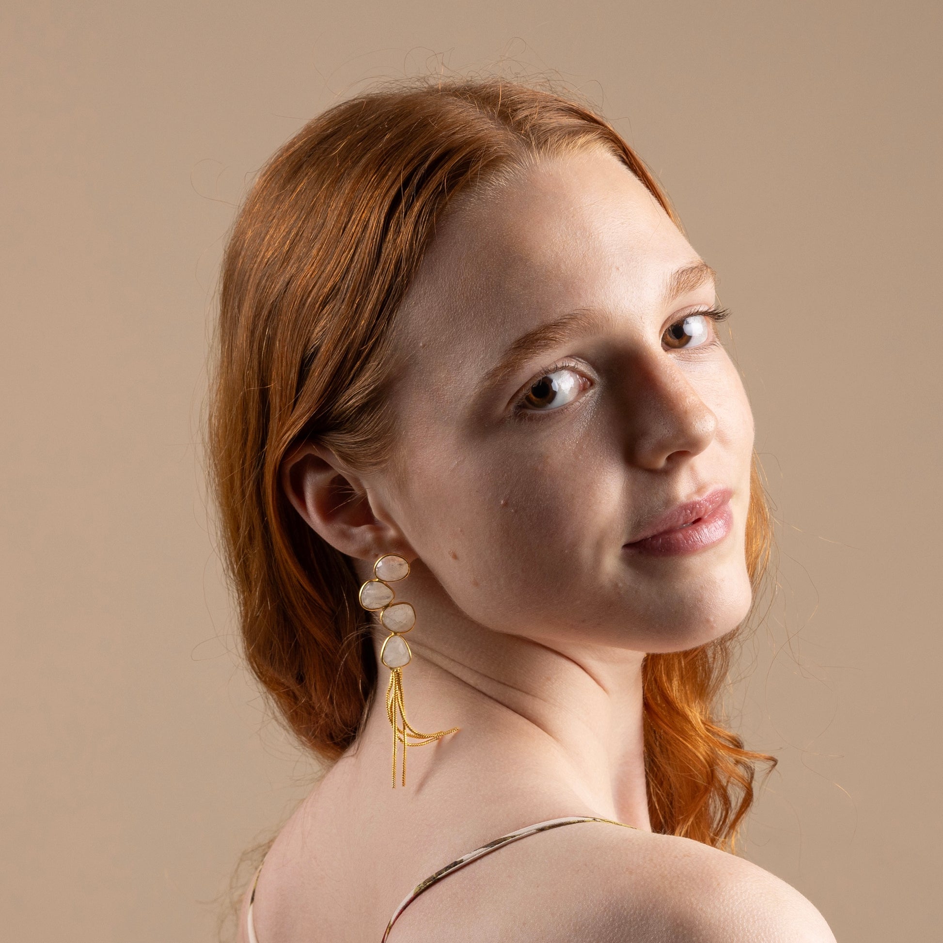 These elegant dangle earrings feature a vertical arrangement of four faceted gemstones, each set in a gold-tone bezel. The top three stones are oval-shaped, while the bottom stone is a larger teardrop shape. Extending from the bottom stone are multiple strands of fine gold chains, creating a beautiful tassel effect. The combination of muted grey gemstones and bright gold setting gives these earrings a sophisticated yet bohemian look, perfect for both casual and formal occasions.