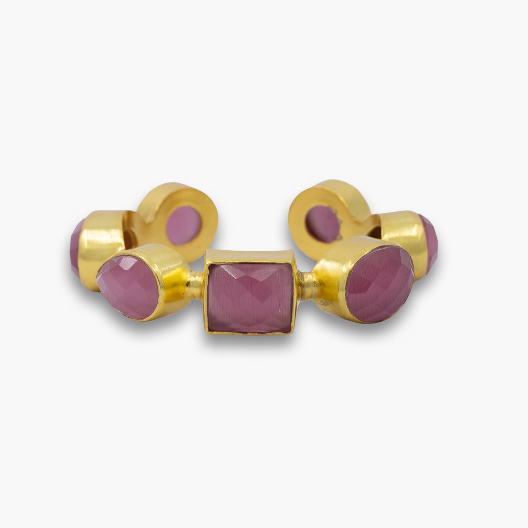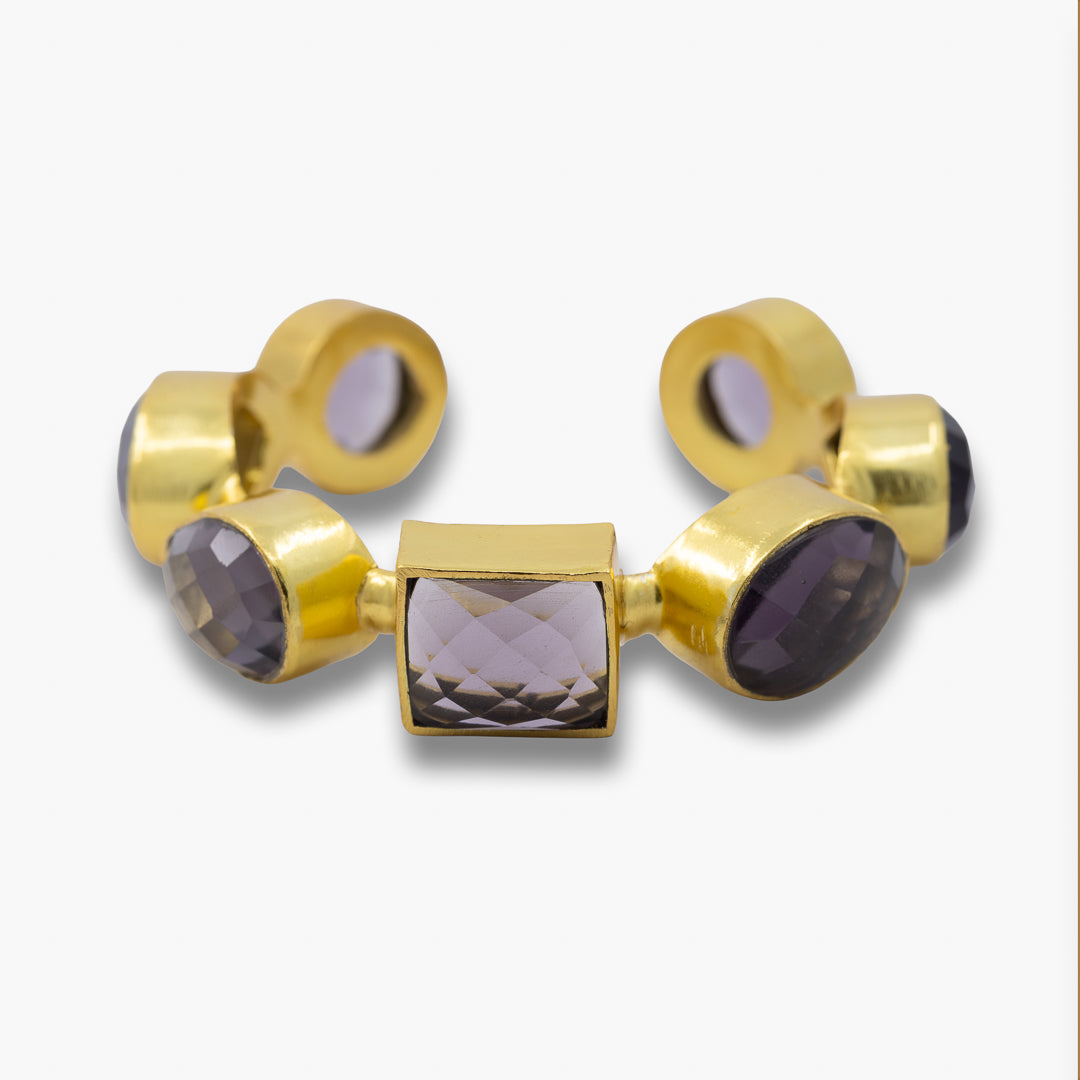 An ode to bold femininity and timeless craftsmanship. The Grace Geometric Cuff embodies the quiet power of the brilliant gemstones known for their grounding energy and luminous depth. Each faceted stone is hand-set within sculpted gold-plated brass, its organic texture evoking the artistry of nature shaped by human hands.