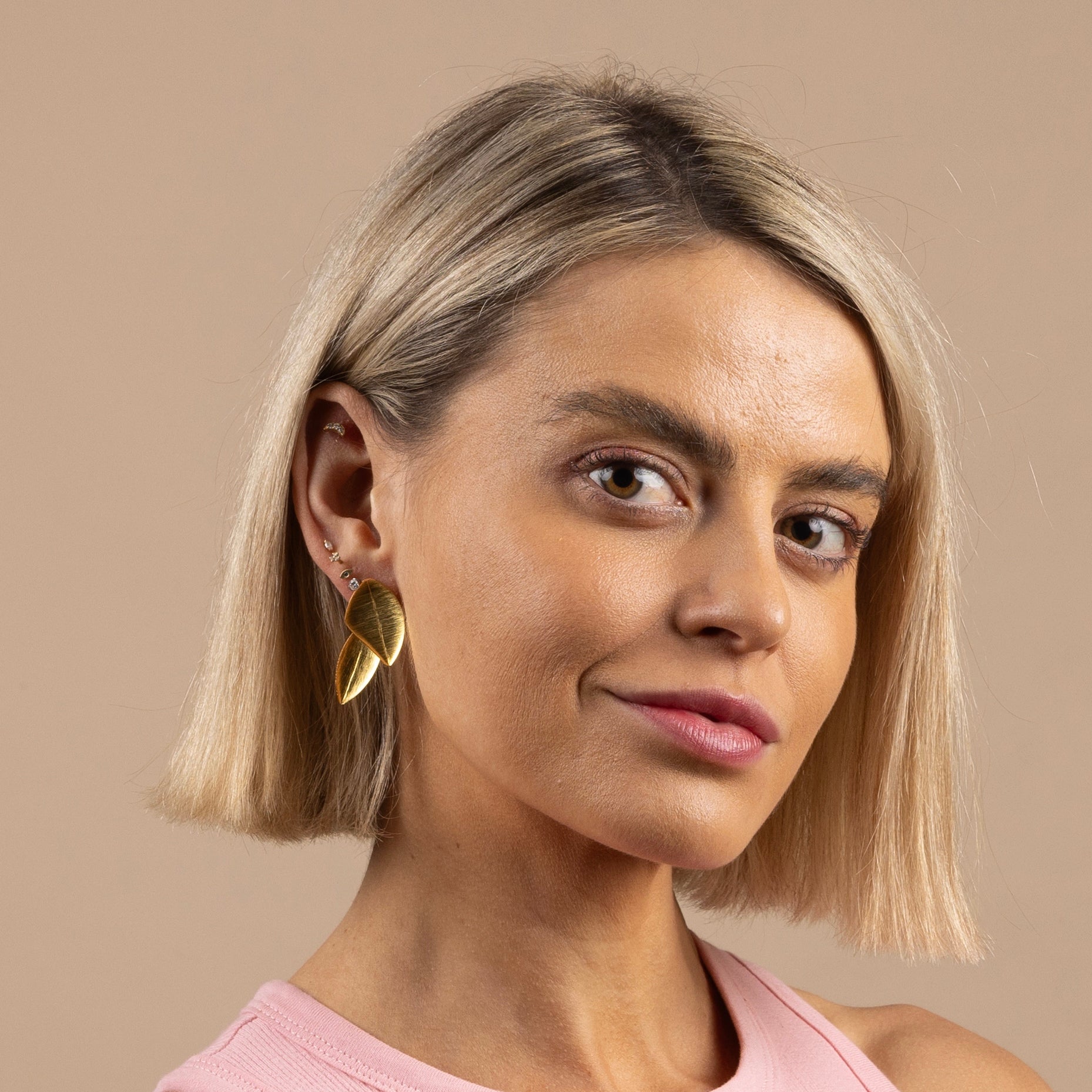 Discover the beauty of nature with our Interlocking Leaf Earrings. These elegant earrings feature a unique design of two interlocking leaf-shaped pieces with a textured surface, crafted in a matte gold finish. The organic and sophisticated look makes them perfect for both casual and formal wear. Add a touch of natural elegance to your collection with these versatile and stylish earrings.