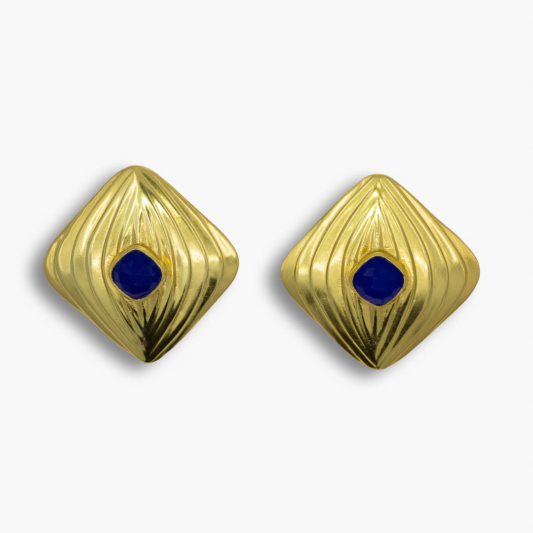 Bold geometry meets twilight elegance in the Midnight Crest Earrings. Featuring faceted alluring gemstones set in textured, diamond-shaped gold-toned frames, these earrings evoke the quiet power of night skies and regal silhouettes. The ridged surface catches the light with every turn, while the rich contrast of gold and blue adds depth and drama. Perfect for evening wear or adding a touch of mystery to your daytime look.